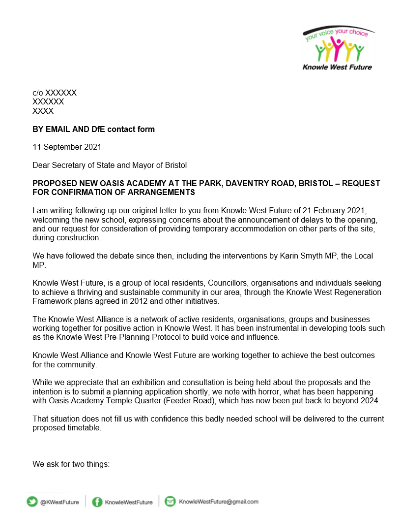 Earlier this year Knowle West Futures and Knowle West Alliance wrote to the Secretary of State for Education and the Mayor about the delay in opening for the new local secondary school; specifically, to request that an interim solution is found for young people who would be starting in Y7 in 2023/24. We have just received a response.
